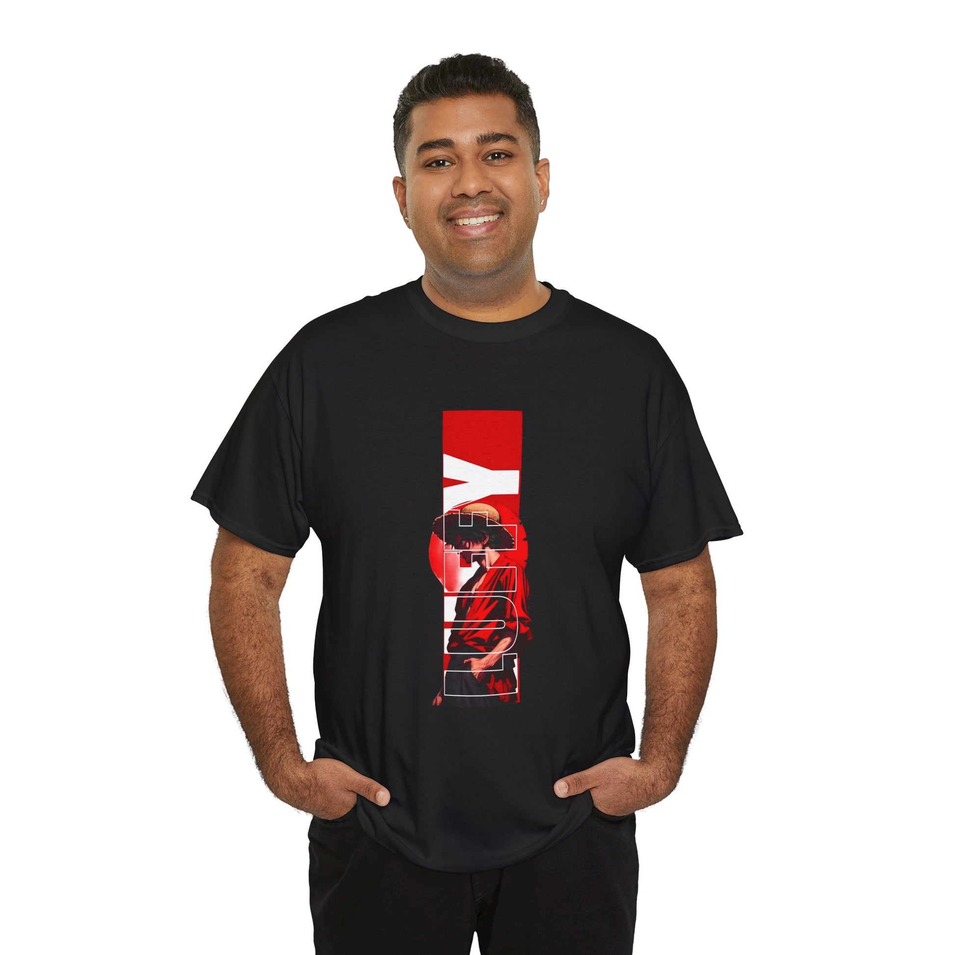 A bold, street-ready tee that wears like a canvas for attitude. This classic crewneck brings a vertical, poster-style graphic front and center — moody reds and stark contrasts combine to create an urban, cinematic silhouette. The medium-weight cotton feels substantial but breathable, draping cleanly for relaxed movement. Wear it under a jacket for nights out or alone with jeans for a statement daytime look. This shirt lives in playlists, late-night walks, and gallery-hopping weekends — it’s for people who dress with purpose and let the design do the talking.