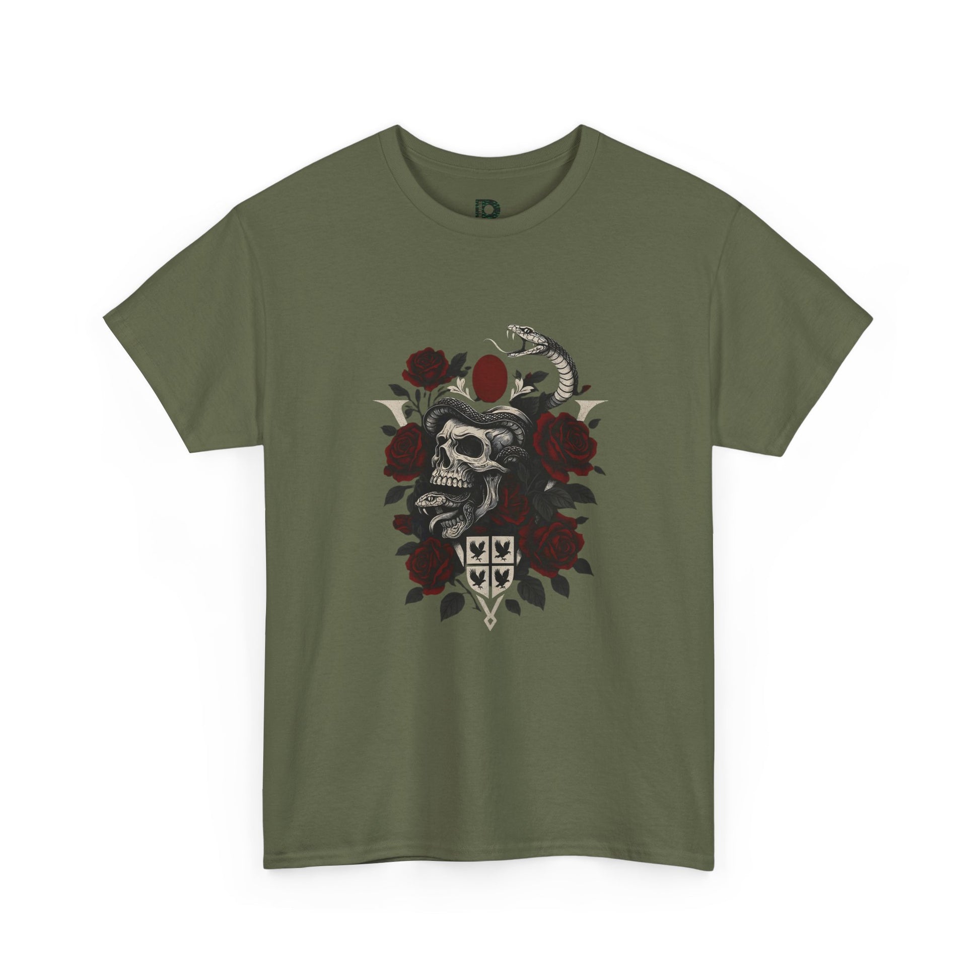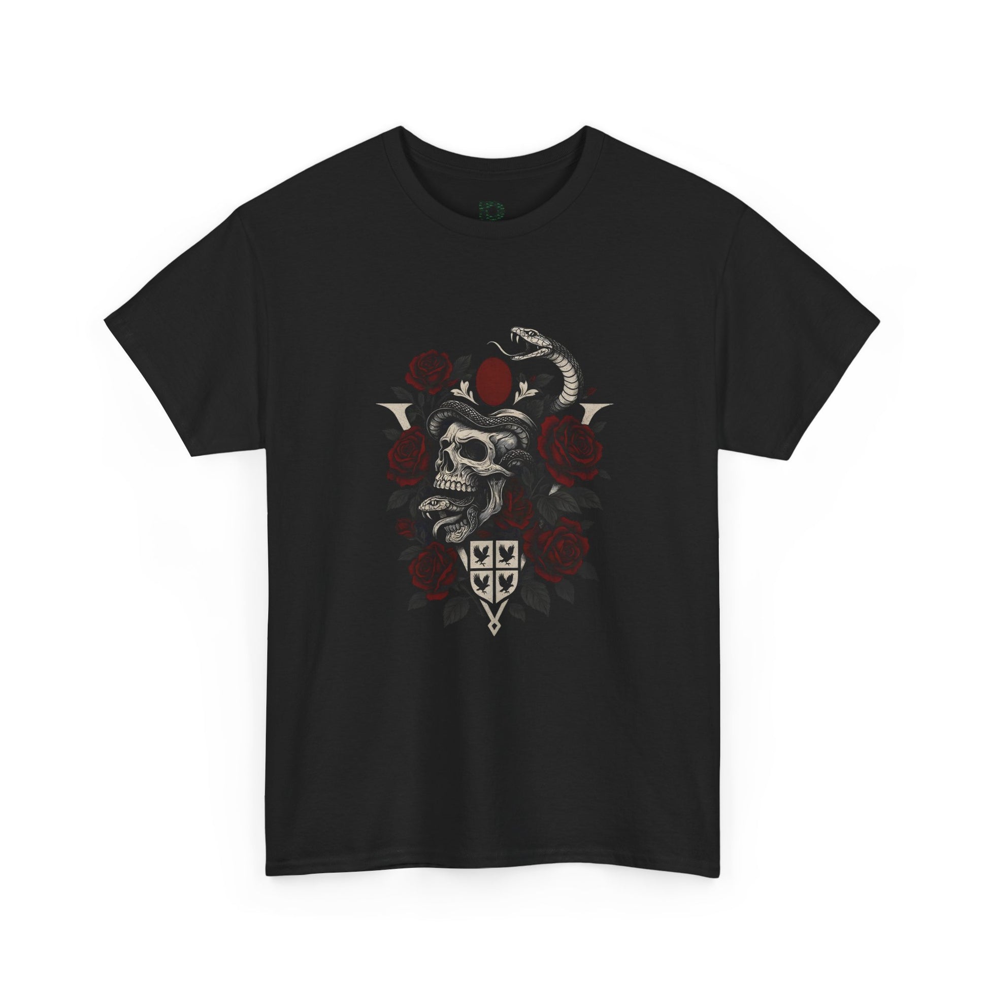 A dark, quietly dramatic tee that wears like a statement. The shirt’s center artwork — a weathered skull, winding serpent and deep red roses — feels like a page torn from a leather-bound sketchbook. It settles into the chest and becomes part of your rhythm: worn under a denim jacket on late-night runs, paired with black jeans at a low-lit show, or layered for a rain-soaked walk. The fit sits relaxed across the shoulders and keeps its shape after wash thanks to a reinforced ribbed collar and shoulder tape. Breathable medium-weight cotton gives structure without stiffness, so the print sits flat and detailed while the tee stays comfortable all day. Ethically grown cotton and tear-away labels mean comfort with conscience.